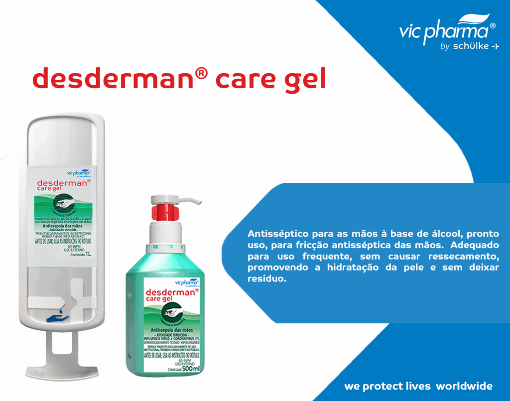 - DESDERMAN® CARE GEL: Antisséptico para as mãos, pronto para uso na fricção antisséptica. Sua fórmula vai além da higienização eficiente: graças ao complexo exclusivo com D-Pantenol e Vitamina E, o produto promove um cuidado contínuo com a pele, garantindo maciez, hidratação e conforto mesmo com o uso frequente. Essa combinação poderosa de ativos hidratantes contribui significativamente para aumentar a adesão à higiene das mãos, pois reduz o ressecamento e torna o processo de assepsia mais agradável no dia a dia. Com DESDERMAN® CARE GEL, a higienização se transforma em um gesto de proteção e bem-estar, resultando em mãos limpas, macias, flexíveis e profundamente hidratadas.