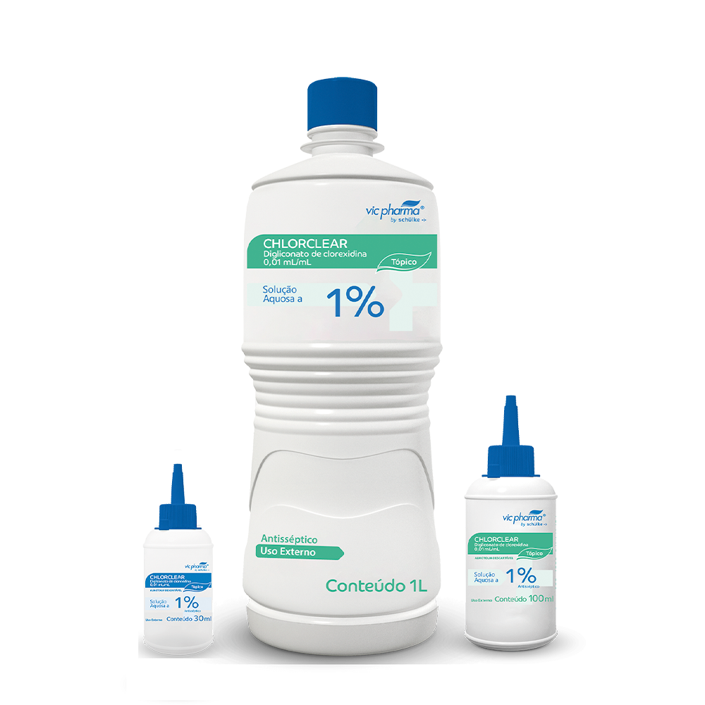 Chlorclear® 1%: Antisséptico tópico para antissepsia de mucosas e pele íntegra antes de procedimentos invasivos. Indicado também para desinfecção pós-degermação e inserção de cateteres. Composição: Clorexidina 1% em meio aquoso.